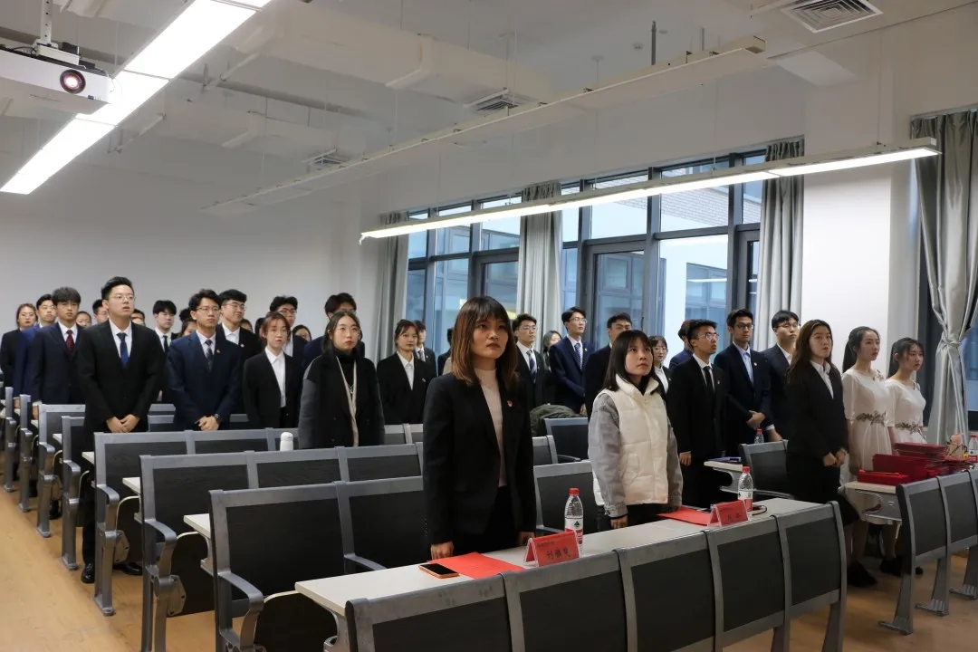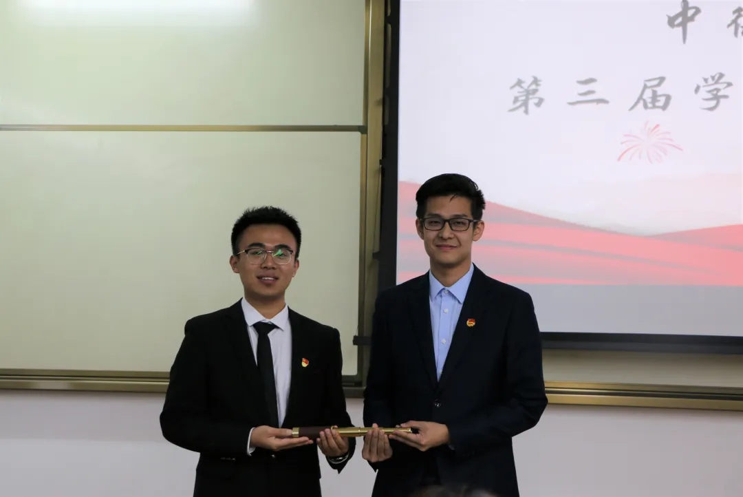 随后,分团委赵婷老师宣读了表彰决定,此次大会表彰了2019—2020学年学生会工作标兵、优秀部长和优秀干事,相关人员依次有序上台领奖并对颁奖老师表示感谢。接下来,分团委刘雅斐老师宣读了第三届学生会干部的聘任决定,新一届学生会干部上台领取聘书。第二届学生会主席程福星同学与第三届学生会主席王辰同学上台并授予传承物,至此,换届仪式顺利完成。