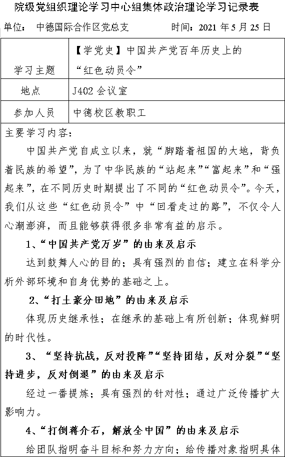上一条:2021年5月第四次教职工集体政治理论学习 下一条:中德校区开展“传承红色基因,夯实同心党建”主题党日暨“学党史 强党性 悟思想“工会主题教育活动