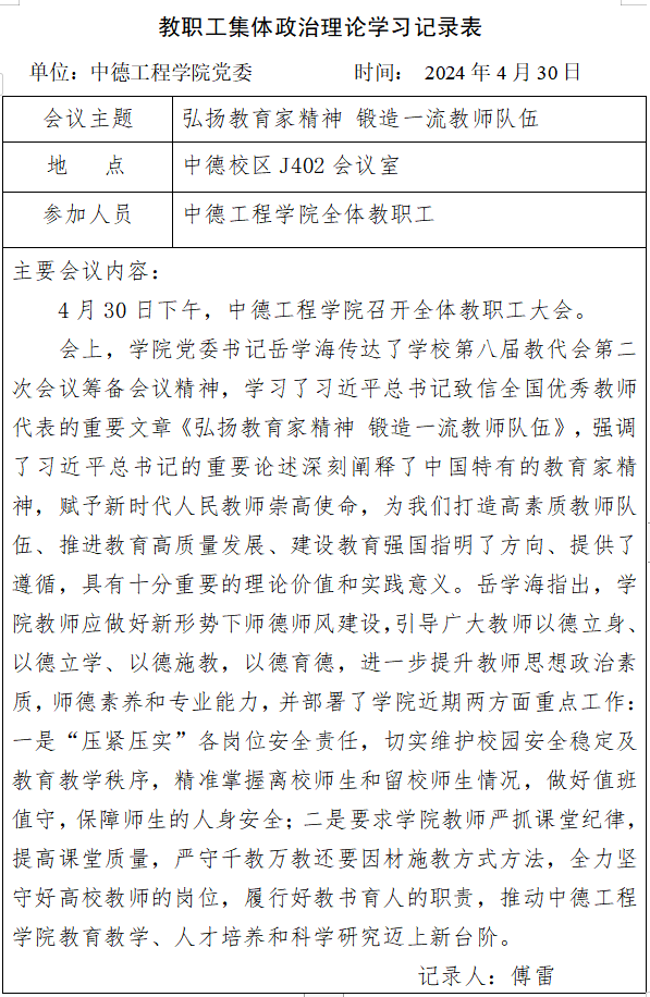 2024年4月第二次教职工集体政治理论学习