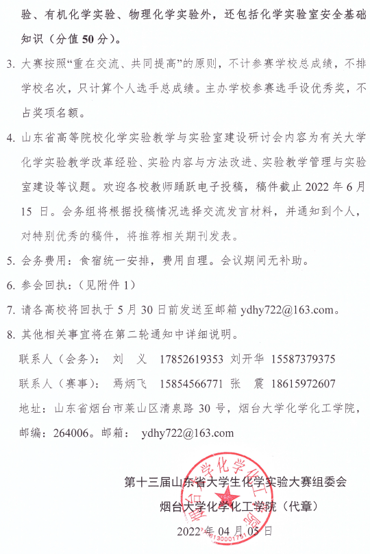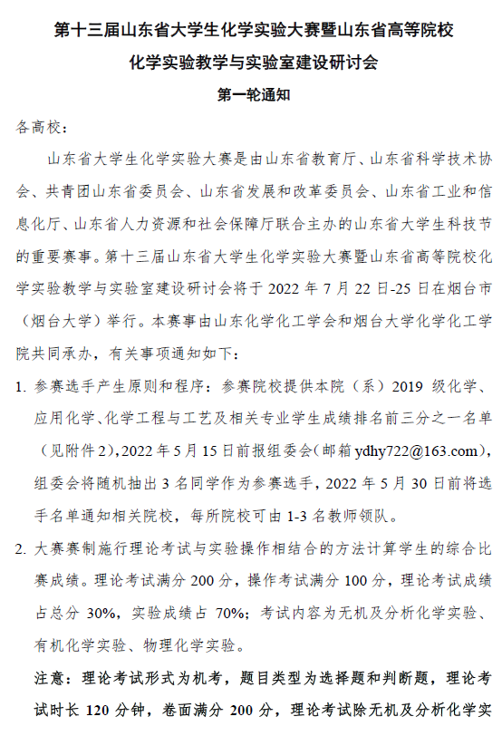 由山东省教育厅等部门组织的第十三届山东省大学生化学实验大赛暨山东省高等院校化学实验教学与实验室建设研讨会将于2022年7月22日—25日在烟台市(烟台大学)举行。